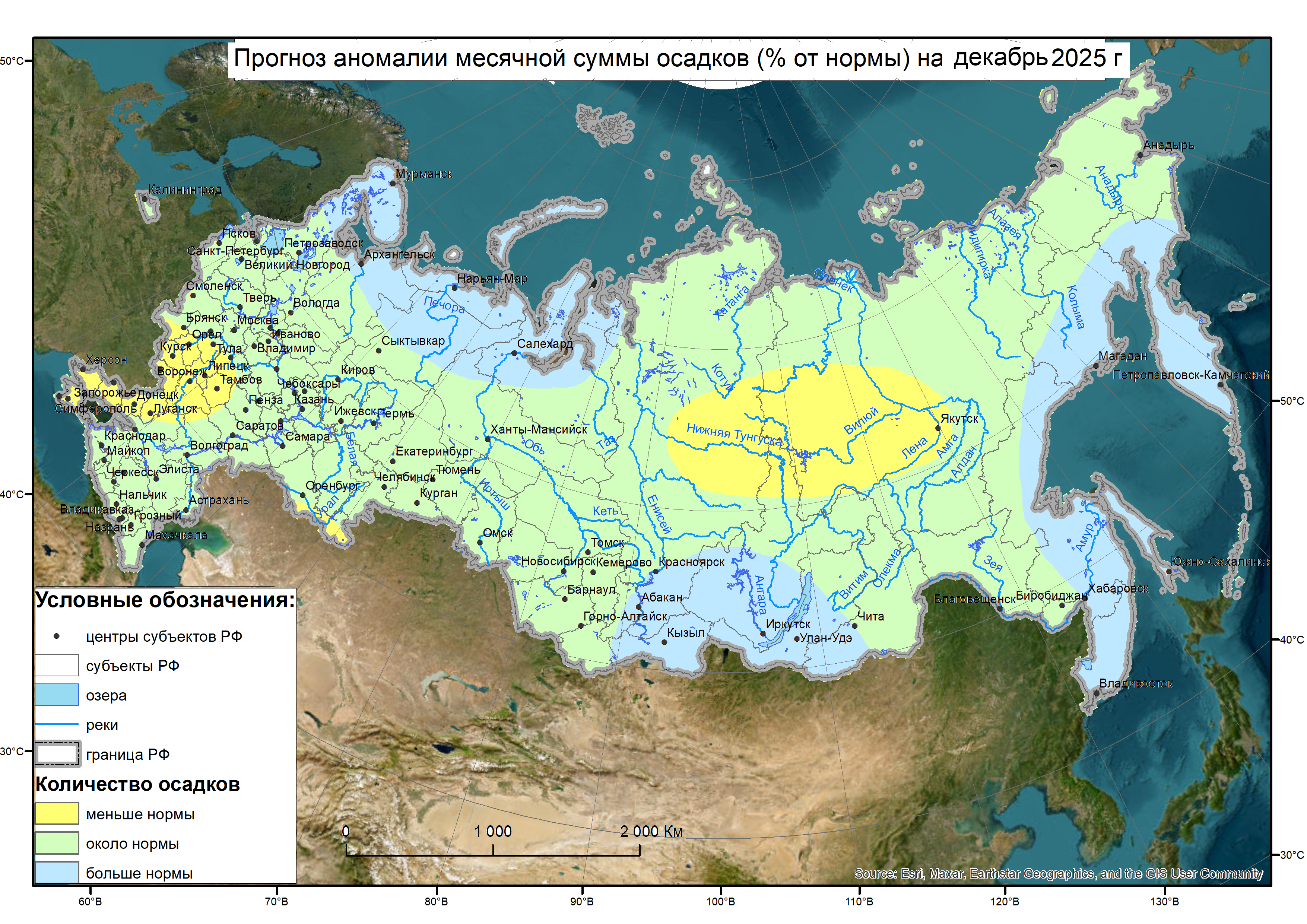 Ожидаемое распределение аномалии температуры воздуха и количества осадков в декабре 2025 г.