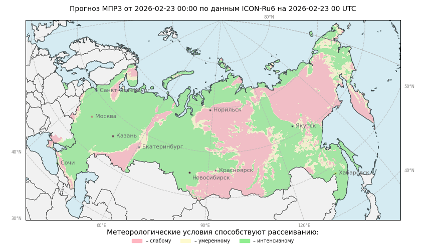 МПРЗ - метеорологический показатель рассеивания и загрязнения приземного воздуха. Метод расчета МПРЗ (разработан в ФГБУ «Гидрометцентр России», авт. д.г.н. Кузнецова И.Н., к.н. Ткачева Ю.В.) основан на учете скорости переноса в пограничном слое атмосферы, типа термической устойчивости и осадков. (Описание метода и алгоритма расчета). Для прогноза МПРЗ используются прогностические величины метеорологических параметров оперативной мезомасштабной модели атмосферы COSMO-RU с горизонтальным разрешением около 7 км.