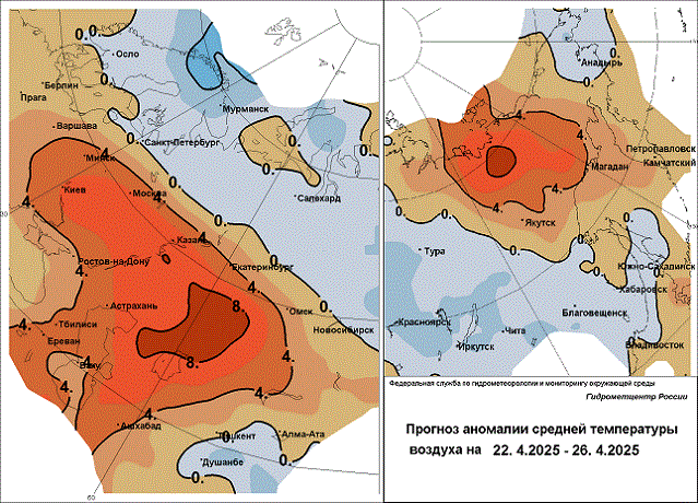 22-24 апреля. На севере Приволжского федерального округа, в Оренбургской области аномально жаркая погода. В Карачаево-Черкесии сильный дождь, ливневый дождь, гроза, град, ветер до 20 м/с. В Камчатском крае осадки в виде дождя, мокрого снега и снега, ветер до 25 м/с, на юге 22 апреля ветер 25-30 м/с, 23 апреля сильный дождь.