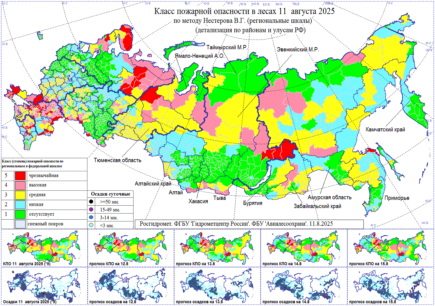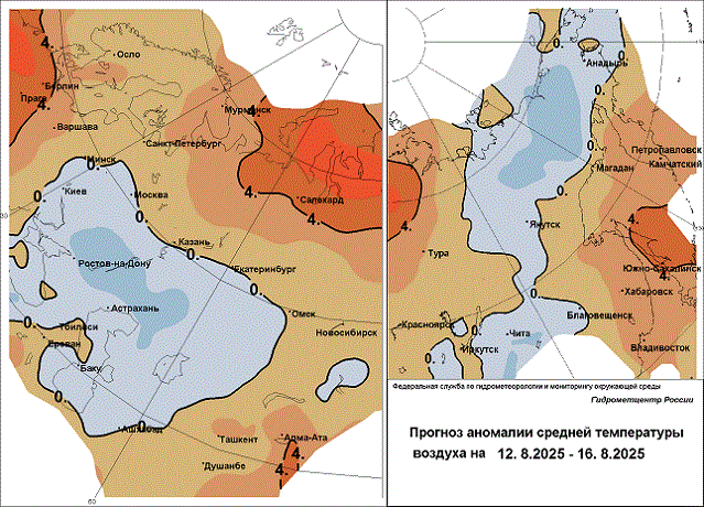 Высокая, местами чрезвычайная пожарная опасность 12-14 августа в Мурманской области, Коми, Южном, Северо-Кавказском федеральных округах, Донецкой, Луганской Народных Республиках, Запорожской, Херсонской областях, Ханты-Мансийском, Ямало-Ненецком а.о., Тыве, на севере Иркутской области, западе Якутии.