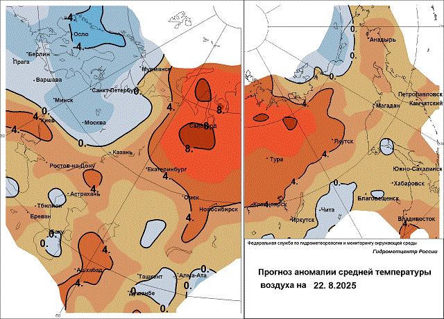 В прошедшие сутки 18 - ночью 19 августа сильные грозовые дожди, обусловленные смещением атмосферных фронтов, отмечались в Амурской области (до 22 мм осадков) и Приморском крае (до 23 мм). Под влиянием многоцентровой депрессии сильный дождь вылил до 48 мм осадков на Камчатский край и до 80 мм на Магаданскую область. Ночью 19 августа в Забайкальском крае очень сильный дождь оставил до 76 мм осадков, за 2 часа выпало до 69 мм влаги в с. Нерчинский завод.