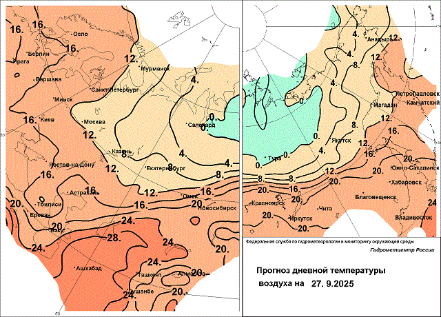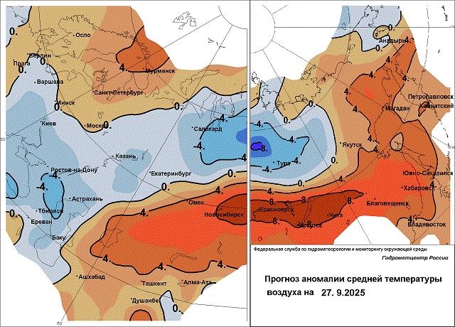 А вот в южных районах Сибири, куда ещё не добрался холод, температура воздуха будет намного превышать значения, свойственные этому периоду. 26 сентября аномалия максимальной температуры составит от +6 градусов в Тыве до +12 градусов Новосибирской и +13 градусов в Иркутской областях. Столбики термометров днём поднимутся от +18…+23 в Центральных районах Красноярского края до +22…+28 градусов в юго-западных областях Сибири. Исключение составят Омская и Томская области, куда начнёт поступать холодный воздух уже завтра, а термометры покажут не выше +11…+16 градусов в Томской области. К 28 сентября в некоторых областях в дневные часы значительно похолодает: в Томской области до +1…+6 градусов, в Омской области и центральных районах Красноярского края до +8…+13 градусов, в Новосибирской и Кемеровской областях до +12…+17 градусов. На Алтае, в южных районах Красноярского края, Хакасии еще сохранятся летние +22…+27 градусов, в Тыве +18…+23 градуса.