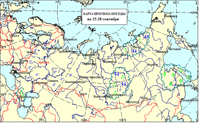На севере Сибири погода уже преимущественно снежная, температурный фон понижен на 0-2 градуса. Ночью потрескивают морозы до -4….-10, местами на Таймыре до -14 градусов. В дневные часы от -3…+2 градуса на юге Таймыра, до 0…-5 градусов в Эвенкии, 0…+5, местами -5 градусов в Туруханском районе.