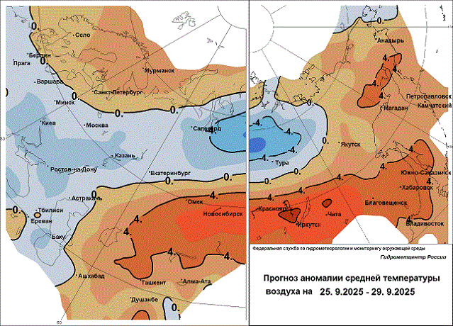 26-27 сентября. Заморозки в Калининградской, Курской (температура ночью -2…-1°), Брянской, Белгородской (-3…-2°), Липецкой, Тамбовской (до -2°) областях. В Ингушетии и Чеченской Республике сильные дождь (в высокогорье со снегом), ливневый дождь, гроза, град, ветер 20-25 м/с. В районе Новороссийска (Краснодарский край) ветер до 28 м/с.