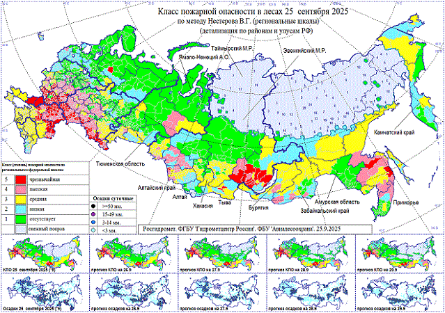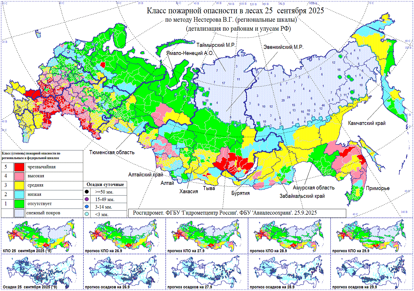 Высокая, местами чрезвычайная пожарная опасность 26-28 сентября в южной половине Центрального и Приволжского федеральных округов, на севере Южного федерального округа, в Донецкой и Луганской Народных Республиках, Омской, Новосибирской областях, на западе Алтайского края, в Бурятии, Забайкальском крае, на юге Иркутской области и Хабаровского края.
