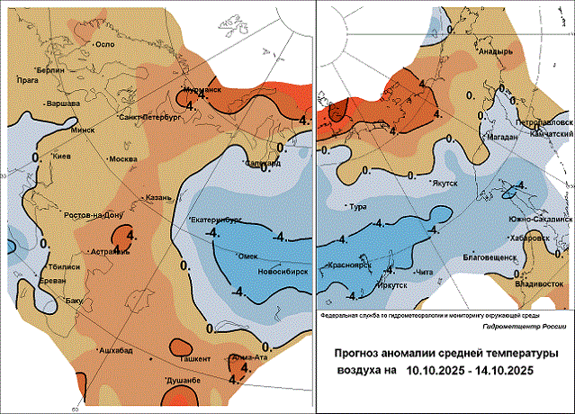 10-12 октября. В Ставропольском крае, Карачаево-Черкесии, Кабардино-Балкарии сильный дождь, ливневый дождь (в горных и высокогорных районах с мокрым снегом), гроза, град, ветер 20-25 м/с. На побережье Магаданской области ветер 17-22 м/с (10 октября до 24 м/с). В Камчатском крае дождь, снег (10-11 октября на юге сильные осадки), в прибрежных районах ветер 25-30 м/с (на юго-западном побережье и на побережье Олюторского района до 35 м/с).