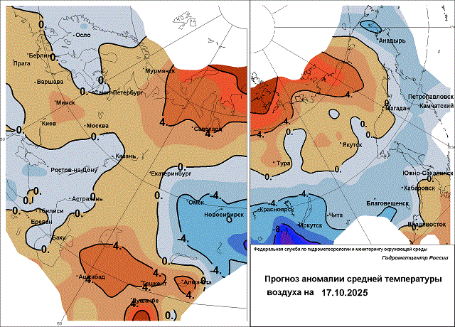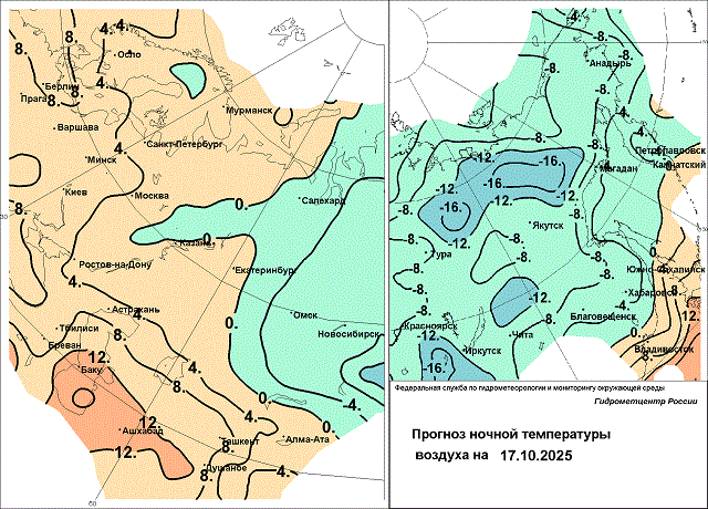 В южной половине Красноярского края, Хакасии, Иркутской области  в предстоящие дни местами будет порошить небольшой снежок, вызванный атмосферными фронтами,  а аномалия  ночной температуры достигнет -10…-11 градусов.  17 октября преобладающая минимальная температура воздуха составит -7…-13 градусов, местами подморозит до -17 , в Тыве – до -20 градусов, в Иркутской области до -22 градусов.  Температура воздуха в дневные часы  15-17 октября в большинстве районов составит -3…+2 градуса; в центральных районах 15 октября опустится до -5 градусов; в Хакасии и южных районах края 17 октября повысится  до 0…+5 градусов; холоднее всего днём 15-17 октября в Иркутской области: 0…-5 градусов, в низких местах до -11 градусов.