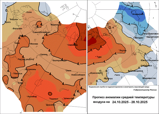 В Приморье, где теплее всего,  днём 25-26 октября воздух прогреется до +8…+13 градусов, это выше нормы на 2-4 градуса; ночные температуры воздуха  отрицательные, морозы составят -3…-9 градусов.