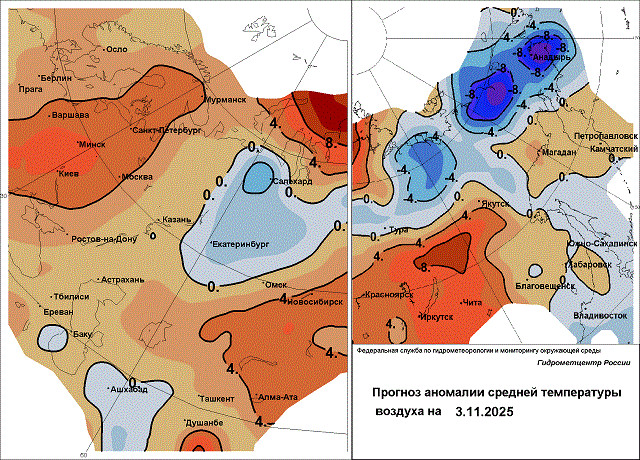 В южной половине Дальнего Востока температурный фон близок к климатической норме, в северной части (на Камчатке, в Якутии, местами в Магаданской области) - на 5-8 градусов ниже нормы. Наиболее холодная погода сохраняется на Чукотке и севере Якутии. Аномалии минимальной температуры воздуха 1-5 ноября в Чукотском округе составят -11…-13 градусов, а морозы достигнут -32…-37 градусов. На севере Якутии примерно такие же температуры: ночью на северо-западе -30…-35 градусов, на северо-востоке -25….-30, при прояснении в низинах до -35…-40 градусов.
