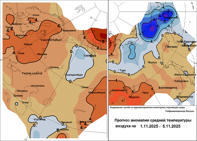 1-2 ноября. В Ханты-Мансийском автономном округе 1 ноября осадки (дождь, мокрый снег, снег), гололедно-изморозевые отложения, 2 ноября сильный снег. На юге Туруханского и Эвенкийского муниципальных округов Красноярского края сильные осадки (снег, мокрый снег), 2 ноября ветер до 25 м/с и более. На Курильских островах сильный дождь, 1 ноября на юге очень сильный дождь, ветер 33-35 м/с, 2 ноября на севере ветер 20-25 м/с. В Чукотском автономном округе снег, метель, на восточном побережье ветер 23-28 м/с (2 ноября до 30 м/с).