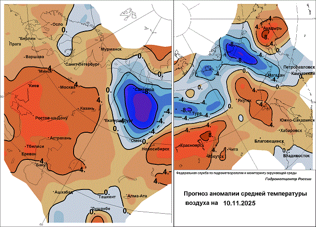 С прибытием циклона в Уральский регион осадки сохранятся. В субботу 8 ноября на Южном и Среднем Урале ожидаются небольшие и умеренные дожди с мокрым снегом, на севере пройдёт снег, на Среднем Урале местами возникнут гололёдные явления. Температура воздуха начнёт постепенно понижаться. Ночью термометры покажут -1…+4 градуса в южной половине, на севере Свердловской области воздух охладится до -9 градусов, на севере Пермского края - до -5 градусов. В дневные часы температура воздуха будет выше нуля: 0…+5, на юге +2…+7 градусов, а на север Свердловской области уже придут морозы до -6 градусов. 9-10 ноября продолжат идти осадки, но преимущественно в виде снега, на юге – мокрого снега, днём местами дождя. 10 ноября на севере Свердловской области ожидается сильный снегопад, а в Курганской и Челябинской областях пройдёт лишь небольшой мокрый снег. В отдельных районах будут наблюдаться гололедные явления (налипание мокрого снега на провода, на дорогах гололедица). Днем местами возможна метель, при порывах ветра 15 м/с. 10 ноября температура воздуха ночью понизится до -4…-10 градусов в Челябинской и Курганской областях; до -8…-14 градусов на севере Пермского края и Свердловской области; до -10…-15, местами -15…-20 градусов на юге Тюменской области; на крайнем севере Свердловской области морозы достигнут -18…-23 градусов. А максимальная температура будет слабо отрицательной и изменяться в пределах -2…+4 градусов, лишь на севере Свердловской области подморозит до -3…-8 градусов, а на юге Тюменской - до 0…-5, местами -5…-10 градусов.