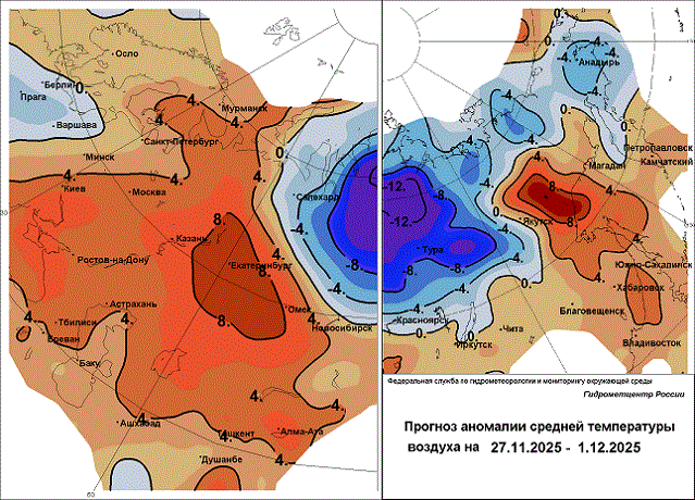 27 ноября под влиянием атмосферных фронтов циклона с северо-запада европейской территории России в Центральном федеральном округе (ЦФО) пройдут небольшие, местами умеренные осадки (снег, мокрый снег, дождь, в южной половине округа в виде дождя). В северной половине округа ожидается налипание мокрого снега, гололед, гололедица, в Костромской области ледяной дождь, в южной половине округа туман. Преобладающая температура воздуха составит ночью -2…5°, на севере округа до -8°, днем 0…7°, на юго-западе до 10°.