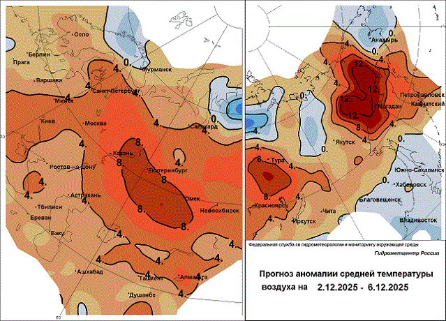 2-4 декабря. В Омской области сильная гололедица. В Чукотском автономном округе снег, метель, ветер на побережье 20-25 м/с (3-4 декабря в районе Певека до 30 м/с).