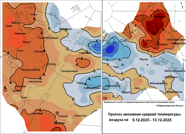 9 декабря. В Ненецком автономном округе ночью снег, метель, ветер 17-22 м/с. В Челябинской области ночью сильная гололедица. На юге Таймырского Долгано-Ненецкого муниципального округа Красноярского края снег, метель, ветер до 25 м/с и более. В Эвенкийском муниципальном округе Красноярского края сильный мороз (минимальная температура -55…-50°). В Хакасии ночью снег (в горах сильный), метель, ветер до 25 м/с и более. На арктическом побережье Якутии снег, метель, ветер 18-23 м/с. На севере Курильской гряды сильные осадки (дождь, мокрый снег, снег).