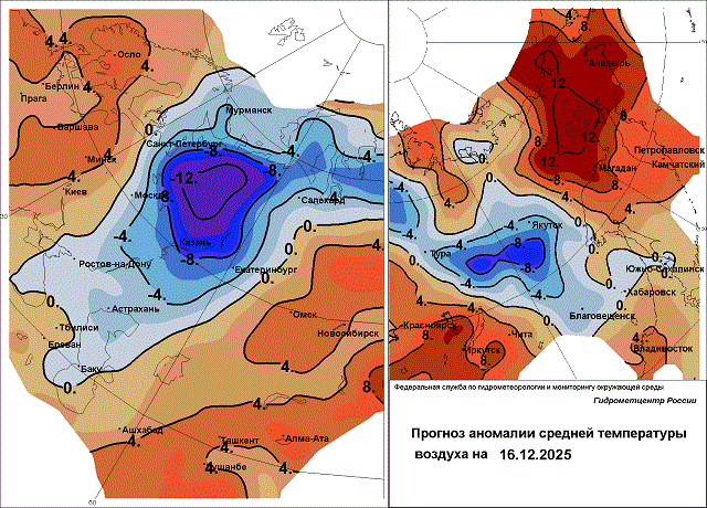 С продвижением циклона на восток на Русскую равнину устремится холодный арктический воздух, повсеместно начнёт понижаться температура воздуха, аномалии минимальной температуры станут отрицательными и с каждым днём все больше и больше отдаляться от нормы. Если 13 декабря на севере, северо-западе страны ночные температуры воздуха будут ниже средних многолетних значений на 2-4 градуса, то к 16 декабря аномалии достигнут -9…-15 градусов. В Поволжье ситуация аналогичная: в Волго-Вятском регионе 13 декабря, на Средней Волге 14 декабря минимальная температура воздуха станет ниже нормы на 1-3 градуса, а к 16 декабря – на 6-10 градусов. На юге Европейской России похолодание произойдёт в более мягкой форме: 12-13 декабря минимальная температура ещё будет опережать норму на 2-6 градусов, а 14 декабря аномалии станут отрицательными и составят -2…-5 градусов.