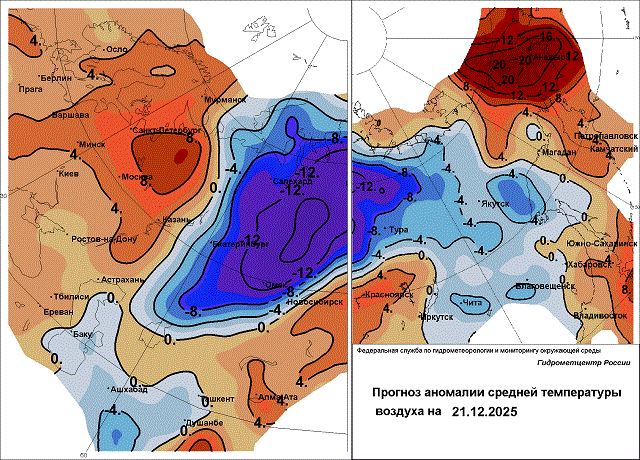 В Магаданской области, Камчатском крае, на Чукотке сохраняется высокой температурный фон: минимальная температура воздуха превышает норму на 4-10 градусов, на Камчатке отклонения от многолетних значений достигают 20 градусов. На юге Дальнего Востока (Амурской области, Хабаровском крае, Сахалине) температурный фон близок к климатической норме. Лишь в Приморье гораздо теплее обычного на 3-10 градусов, а максимальная температура 20 декабря составит +1…+6, на севере 0…-5 градусов. Особенно холодно в Якутии, на западе минимальная температура воздуха ниже многолетних показателей на 4-10 градусов, а температура воздуха опустится до -48…-53 градусов.