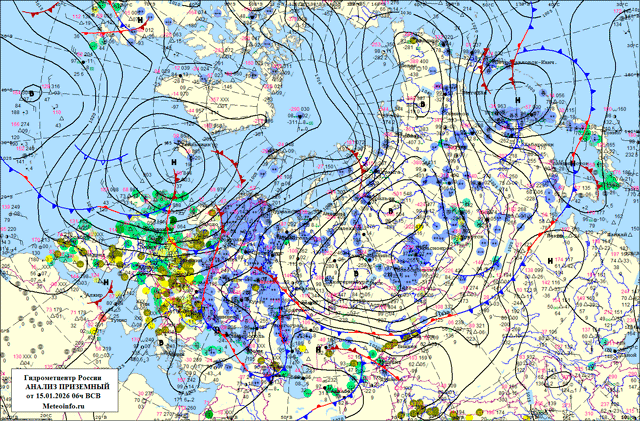 16 января. На юге Тюменской области аномально холодная погода. На Таймыре снег, метель, ветер до 22 м/с. В Эвенкии сильный мороз (температура -55° и ниже).