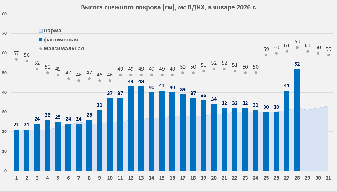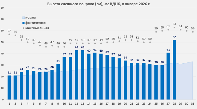 Норма высоты снежного покрова от 30 см 26 января до 33 см 31 января. Рекордные значения за этот же период 56-57 см отмечались в 1956 г. (и в 1994 г. 26 и 27 января).