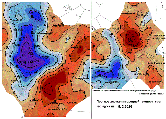 Холодный арктический фронт циклона, перемещающегося с северо-запада на Среднюю Волгу, принесёт в южные регионы значительное понижение температуры воздуха. Среднесуточная температура воздуха ожидается на 8-14 градусов ниже климатической нормы. В Волгоградской области 2-5 февраля установится аномально холодная погода. 3 февраля на севере Ростовской, Волгоградской и Астраханской областей морозы достигнут -22...-28 градусов, 4 февраля в Волгоградской области ночью до – 32 градусов, днём - до -17…-22 градусов. На севере Краснодарского края 4 февраля воздух остынет до -15…-20 градусов, днём до -8…-13 градусов.