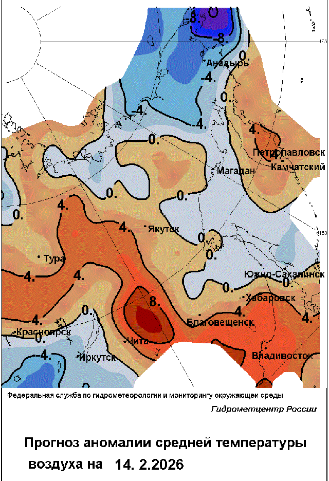 На Чукотке и в Магаданской области 13-15 февраля местами выпадет небольшой снег. 12-13 февраля на восточном побережье Чукотского автономного округа ветер усилится до 23 м/с. Температура воздуха на Чукотке будет удерживаться в пределах -30…-35, местами -20…-25 градусов, в континентальной части при прояснениях подморозит до -40…-45 градусов. В континентальных районах Магаданской области 14-15 февраля морозы ночью достигнут -37…-42, местами -47 градусов; на побережье с каждым днём температура будет понижаться: ночью от -14…-19 градусов 13 февраля до -21…-26, местами -31 градуса 15 февраля, днём от -9…-14 до -17…-22 градусов соответственно.
