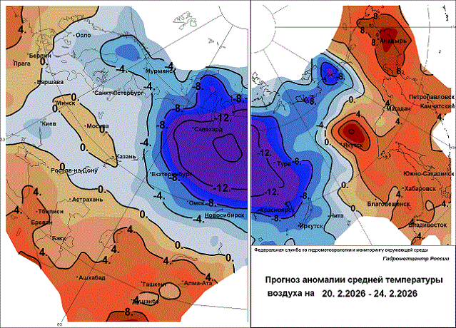 Большую часть Уральского региона и Сибири занимает обширный арктический антициклон; в области его влияния преобладает холодная погода с температурой воздуха на 5-10°, местами на 11-16° ниже средних климатических значений.