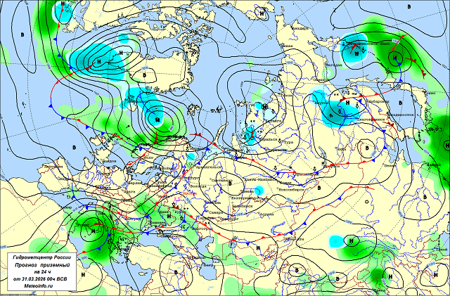 Вчера 30 марта атмосферные фронты сибирского циклона доставили осадки различной интенсивности и в разных фазах в Забайкалье, Бурятию и западные регионы Якутии. 30 - ночью 31 марта в Якутии отмечался сильный снегопад, оставивший до 17 мм осадков, мела метель, ветер достигал 29 м/с. В Забайкальском крае и Бурятии ветер усиливался до 21-22 м/с. Под влиянием другого циклона 30 марта на юге Дальнего Востока (в Хабаровском крае, Амурской области, Еврейской а.о.) прошли осадки в виде снега, мокрого снега и дождя, в Хабаровском крае зарегистрированы сильные осадки, выпало до 15 мм влаги...